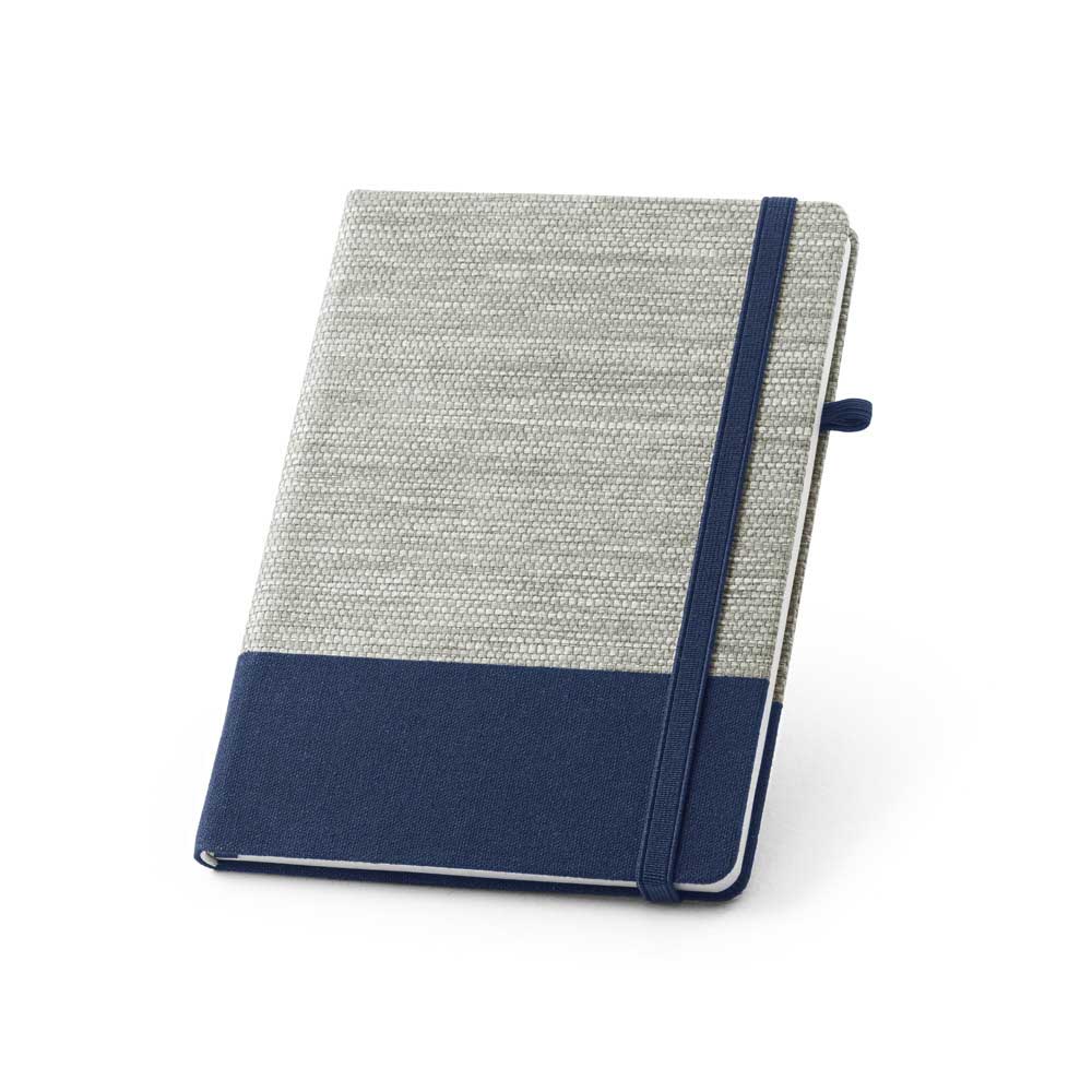 Caderno A5 de capa dura em palha e algodão canvas. Contém 96 folhas pautadas, fita separadora, elástico e suporte para esferográfica (não inclusa). Tamanho: 150 x 210 mm. 53268