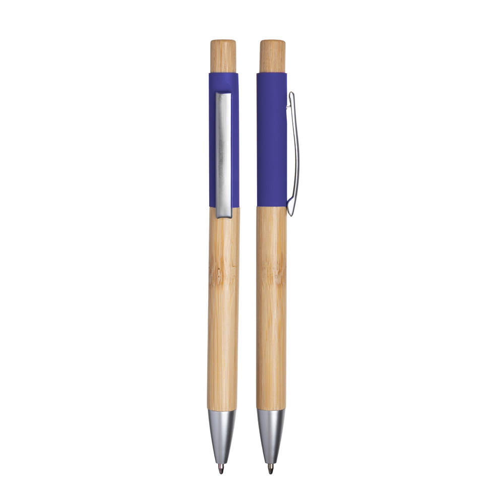 Caneta esferográfica em alumínio reciclável com escrita em azul. Acionador e corpo em bambu.