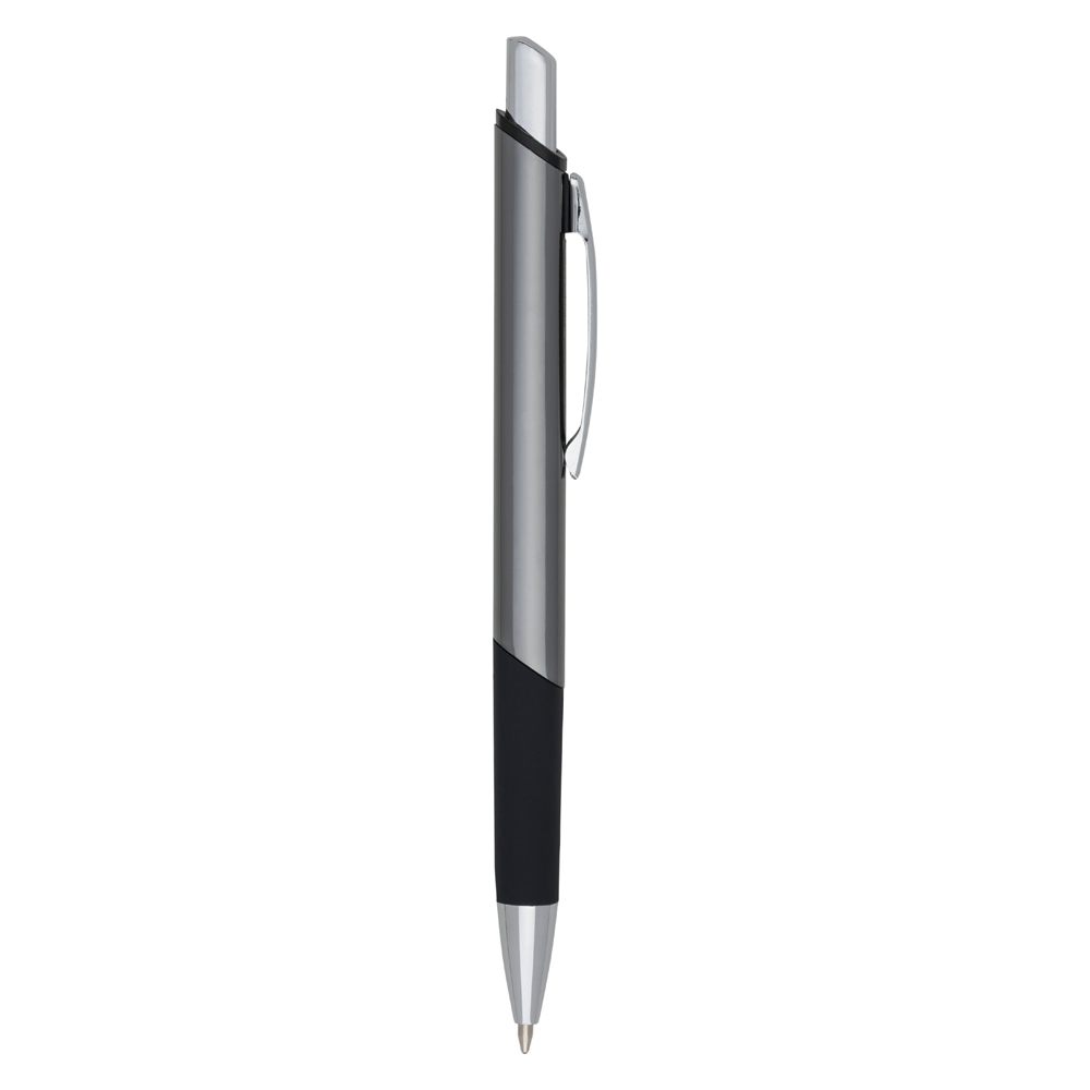 Caneta esferográfica metálica, corpo colorido com pintura brilhante metalizada e detalhe emborracha preto na parte inferior. Clip de metal, aciona por clique.